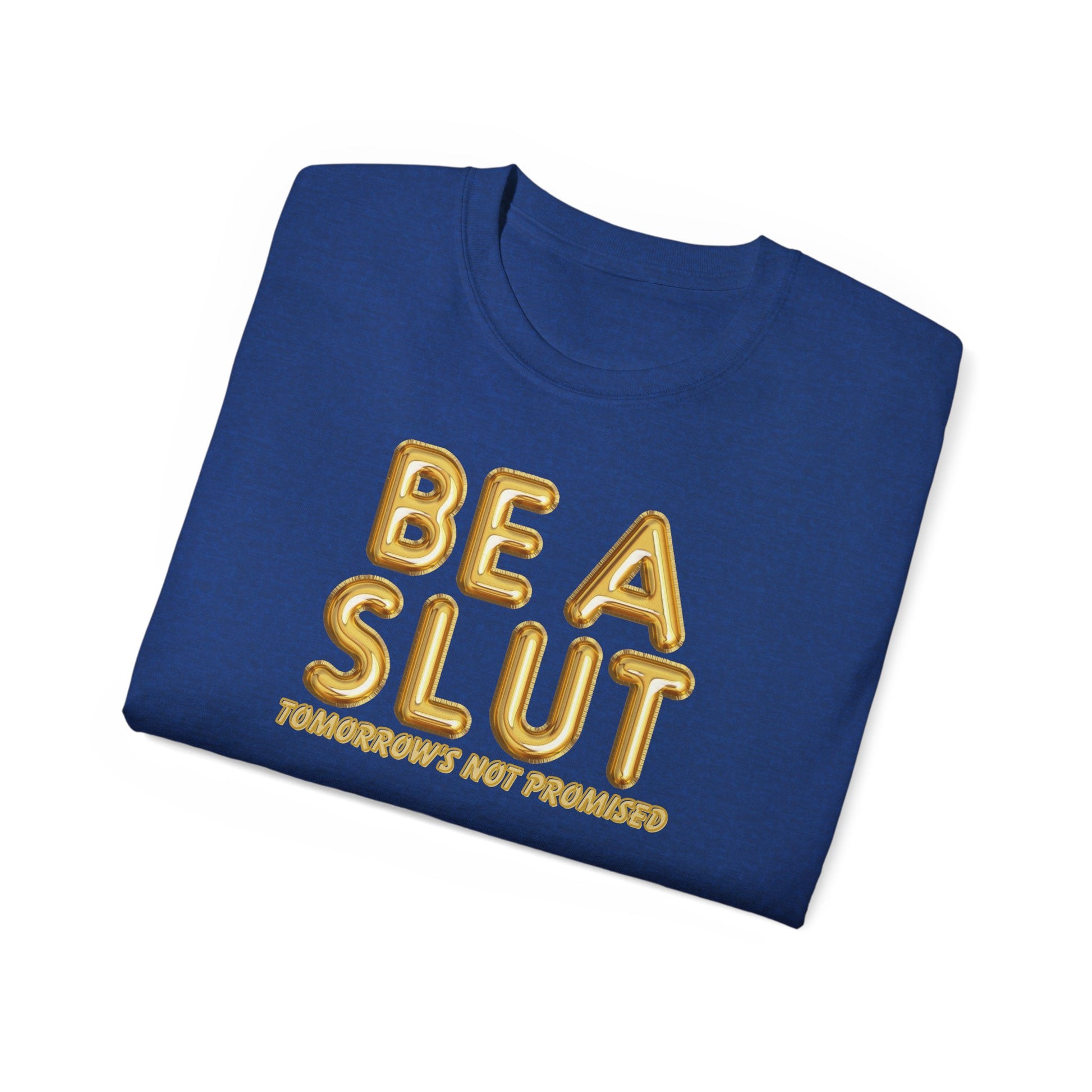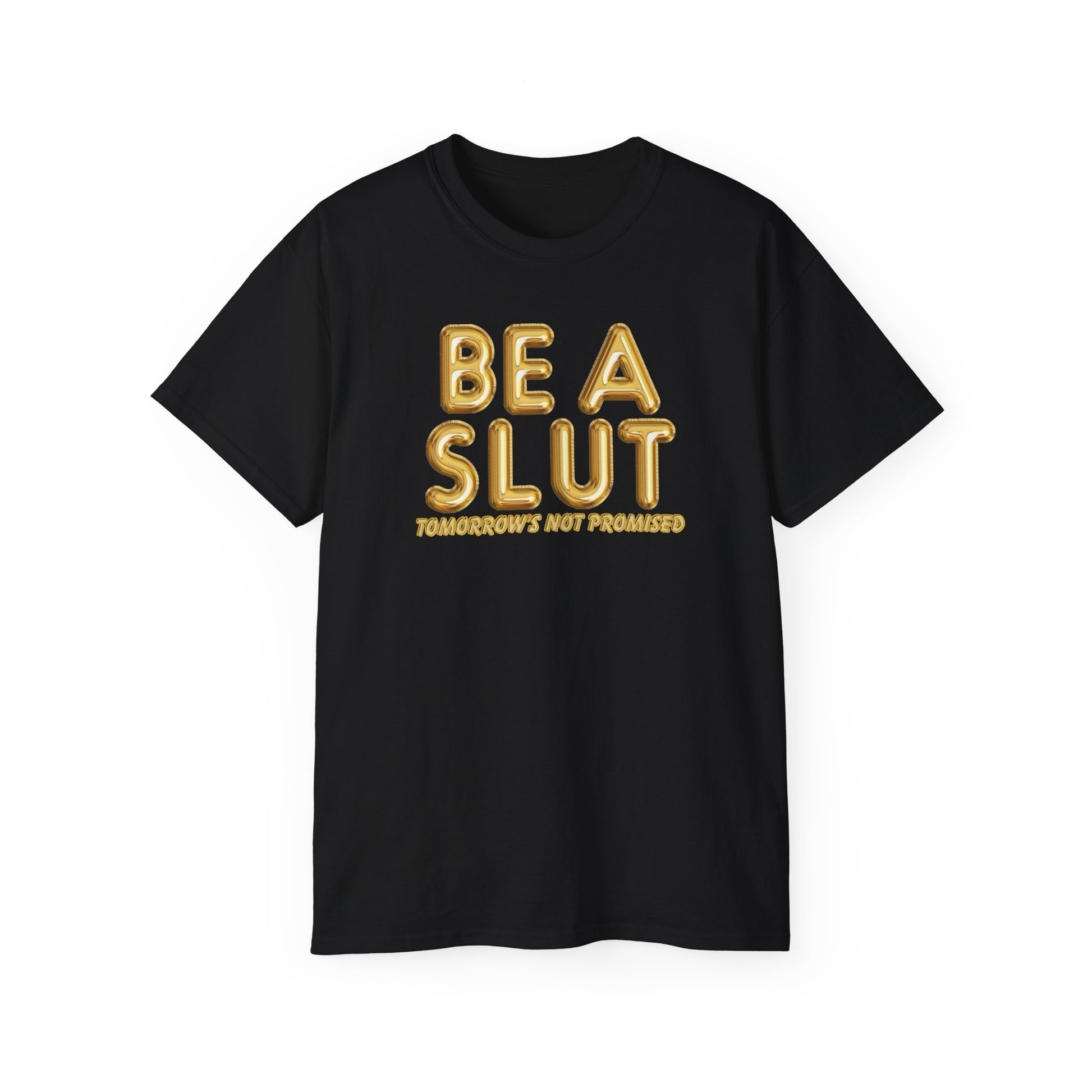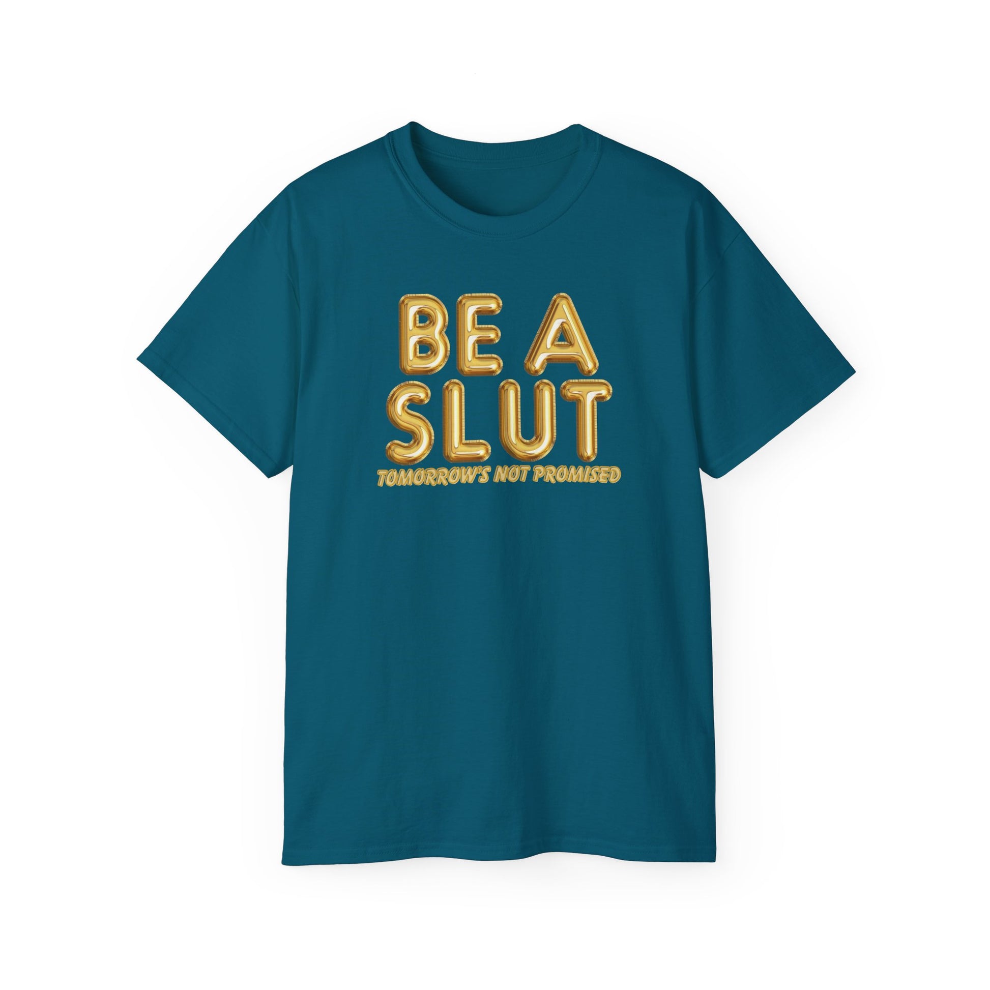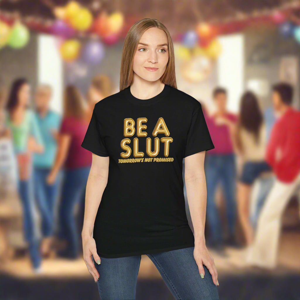Tomorrow's not promised, so why wait? Our Be A Slut tee is a daring call to live authentically and without regret. Featuring a playful balloon letters, this shirt isn't just a statement, it's a vibrant anthem to living on your own terms. This tee is all about owning your choices, embracing pleasure, and shedding societal expectations. Don't just exist, live vibrantly and celebrate every moment!