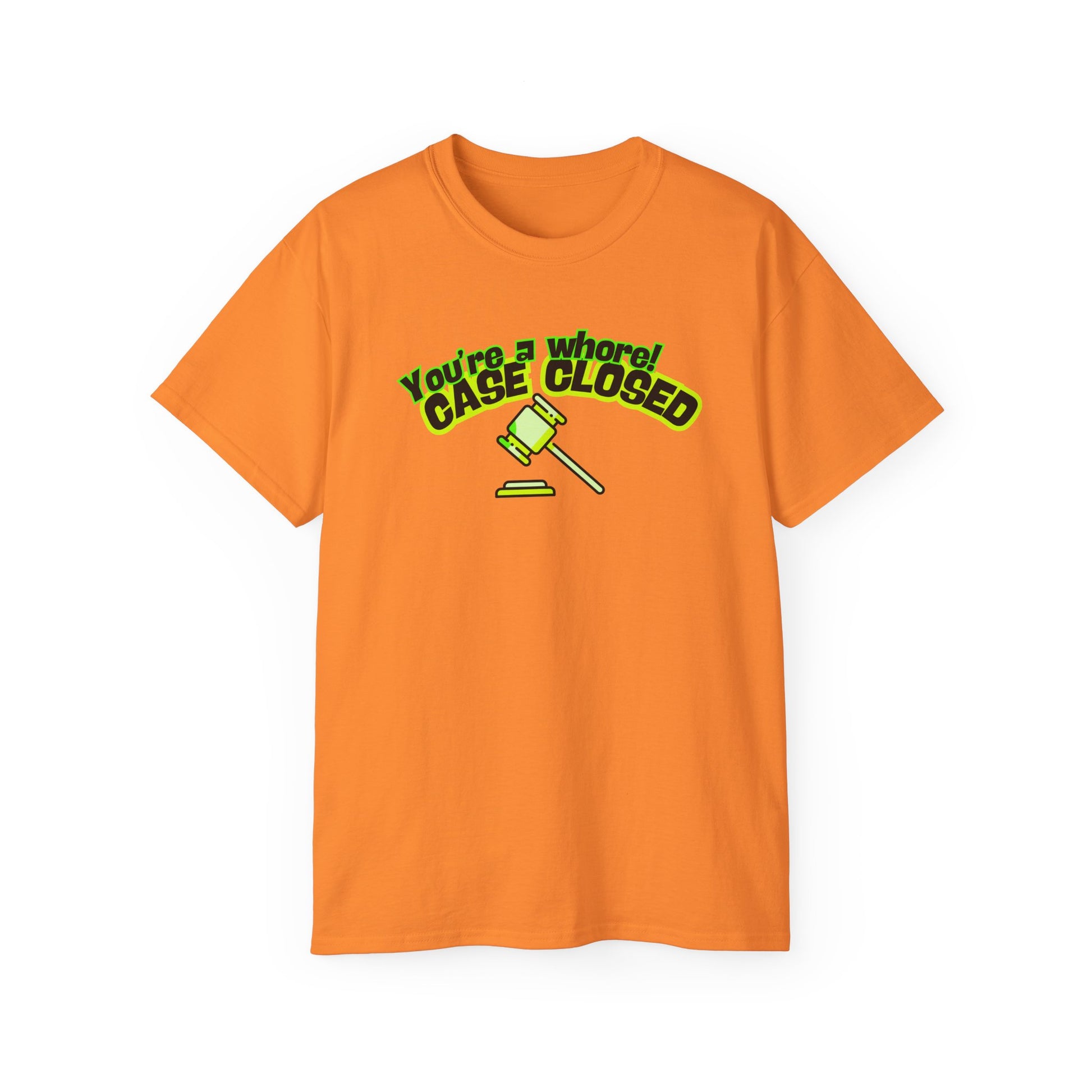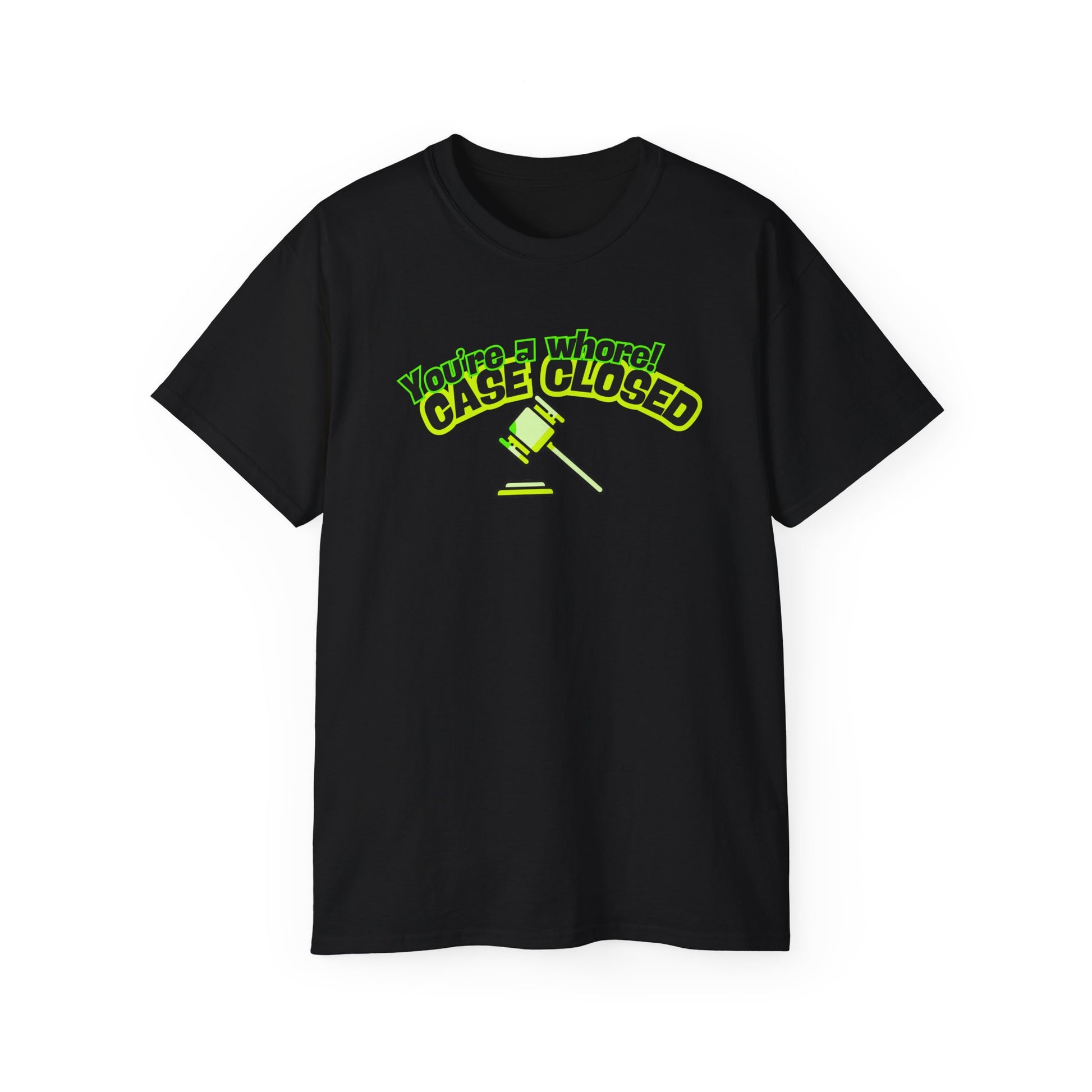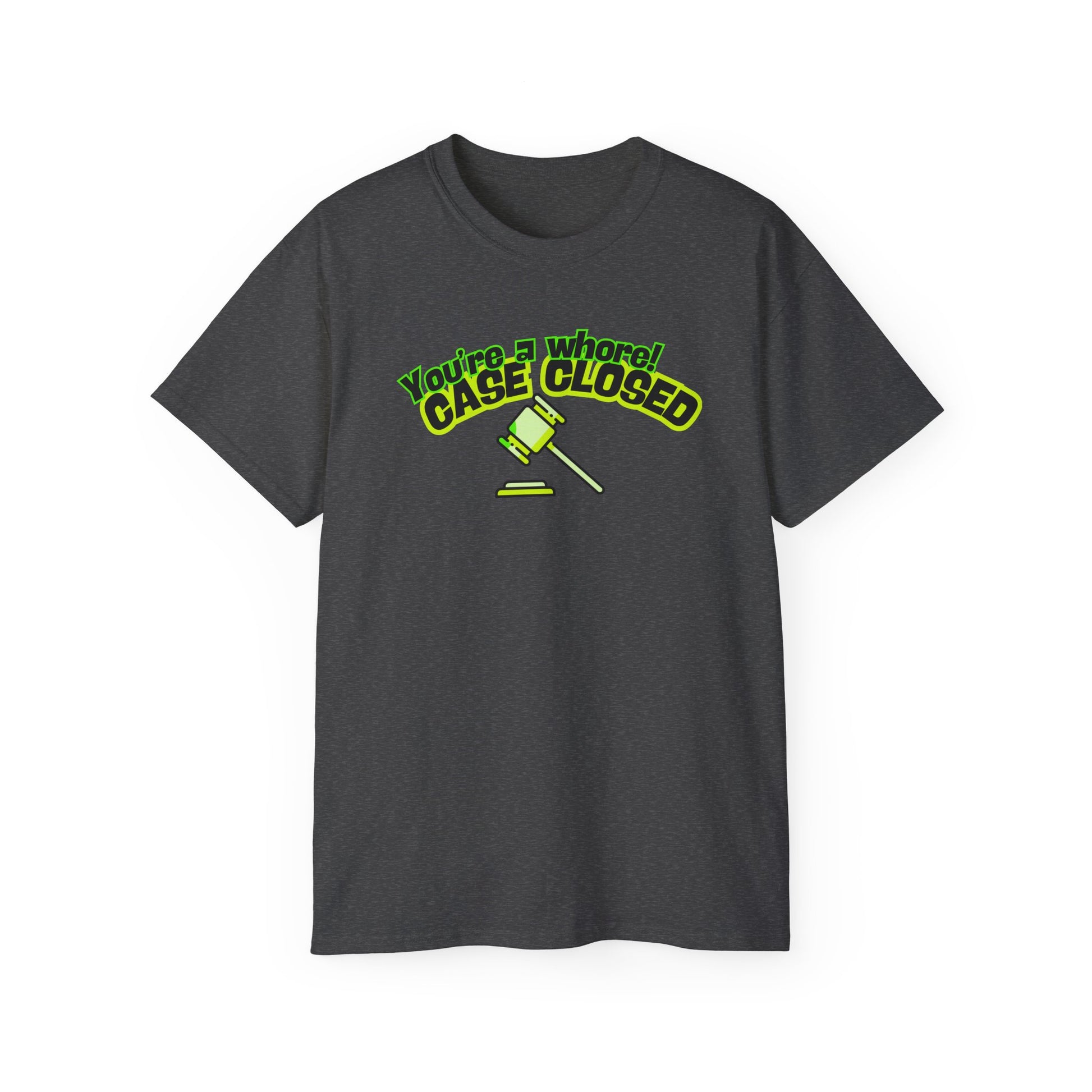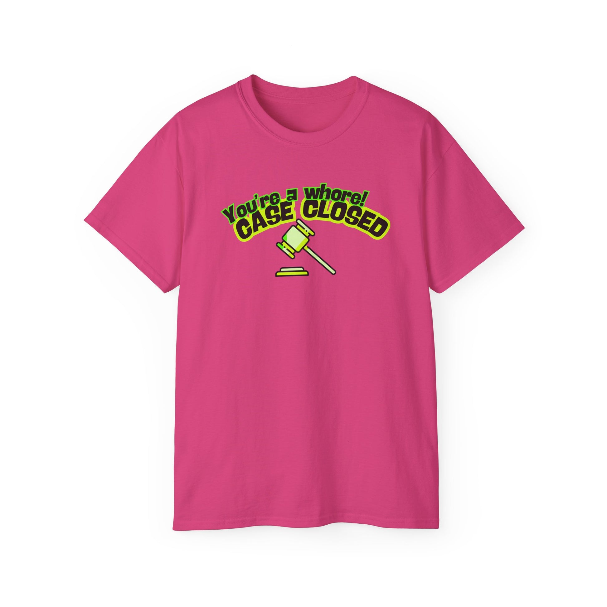 Judgment Has Been Passed: You're a Whore (Congrats!). Make your verdict known with our Cased Closed t-shirt. It's designed for those who aren't afraid to speak their mind, own their sexuality, and command attention. Own your narrative and defy judgment, this design is a powerful gavel-strike against conformity. Wear the verdict with pride and let the courtroom of public opinion take note.This isn't just an accusation; it's an affirmation!