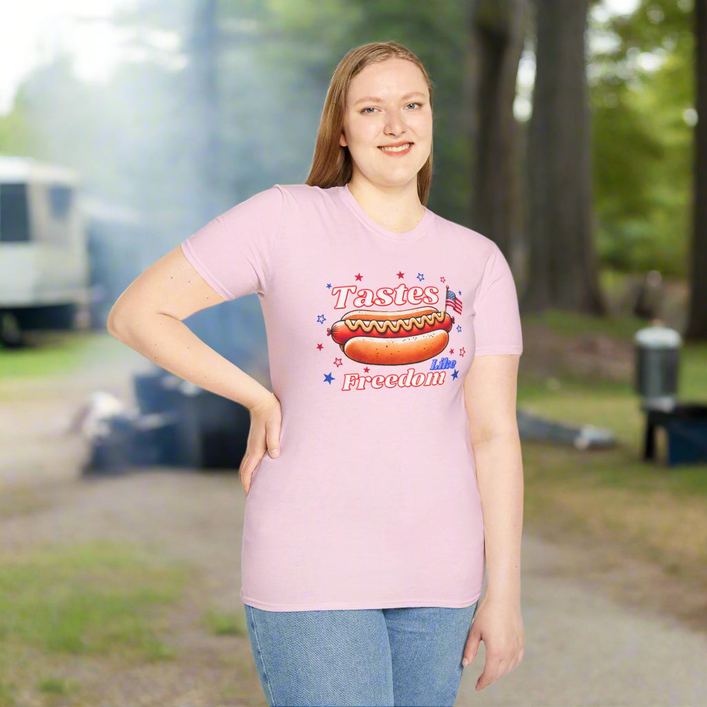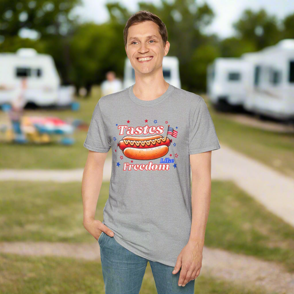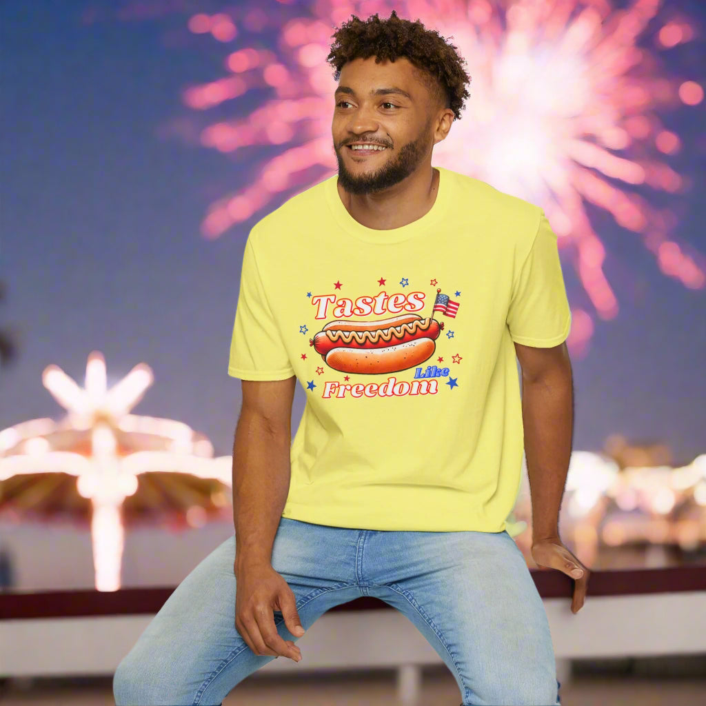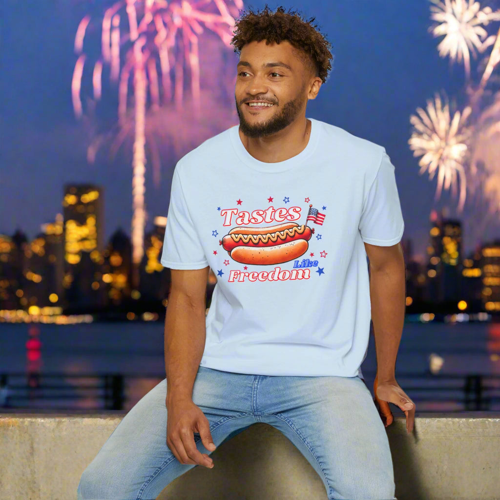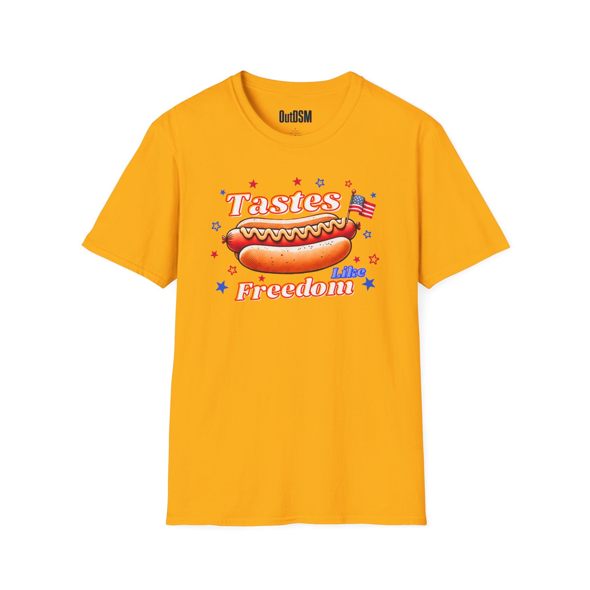 This isn't just a hot dog; it's a declaration. Our "Tastes Like Freedom" tee rips into the heart of American grit and the unapologetic spirit that built this nation. Take a bite out of Americana and remember the backyard barbeques, 4th of July Fireworks and that endless summer feeling. Grab yours today and let freedom ring (and taste delicious)!